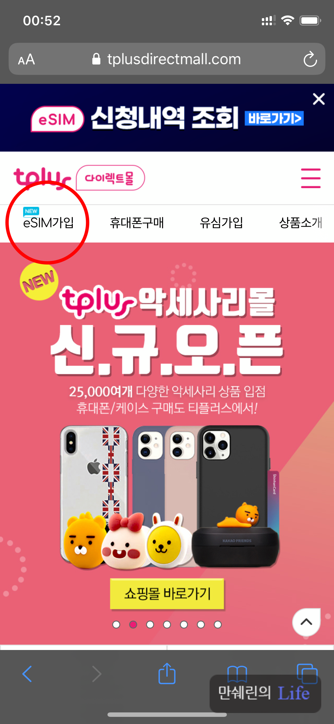 홈페이지에 접속을 하면 왼쪽 상단에 eSIM 가입을 발견할 수 있습니다.
