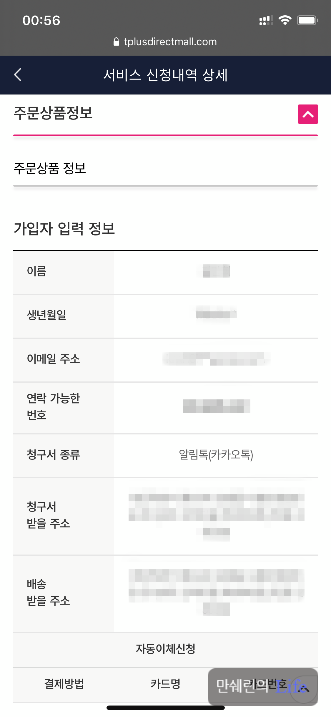 그리고 쭉 내리면 가입자 정보등을 입력 할 수 있고, 결제 정보를 입력해야 합니다.