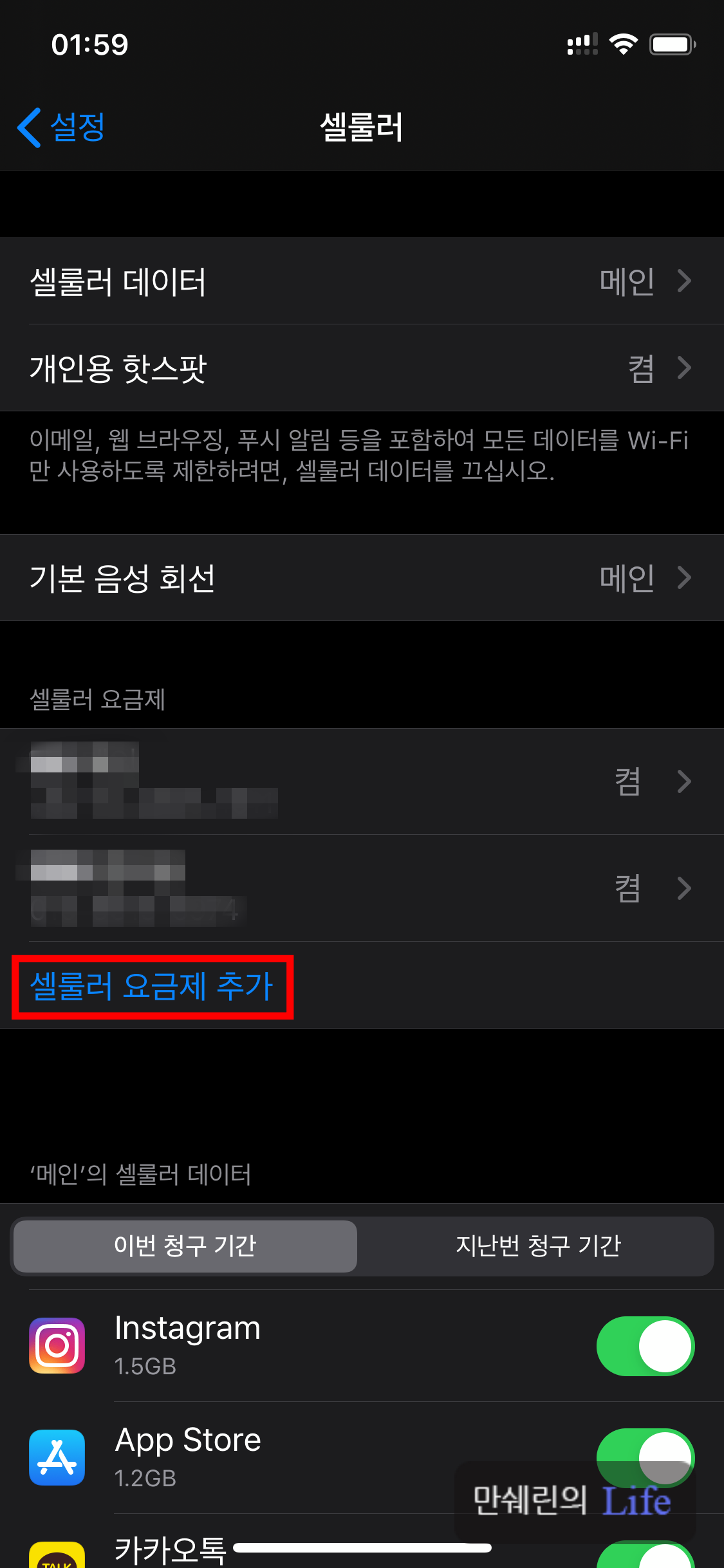 아이폰의 설정 - 셀룰러 - 셀룰러 요금제 추가를 선택하여 요금제를 추가 할 수 있습니다.