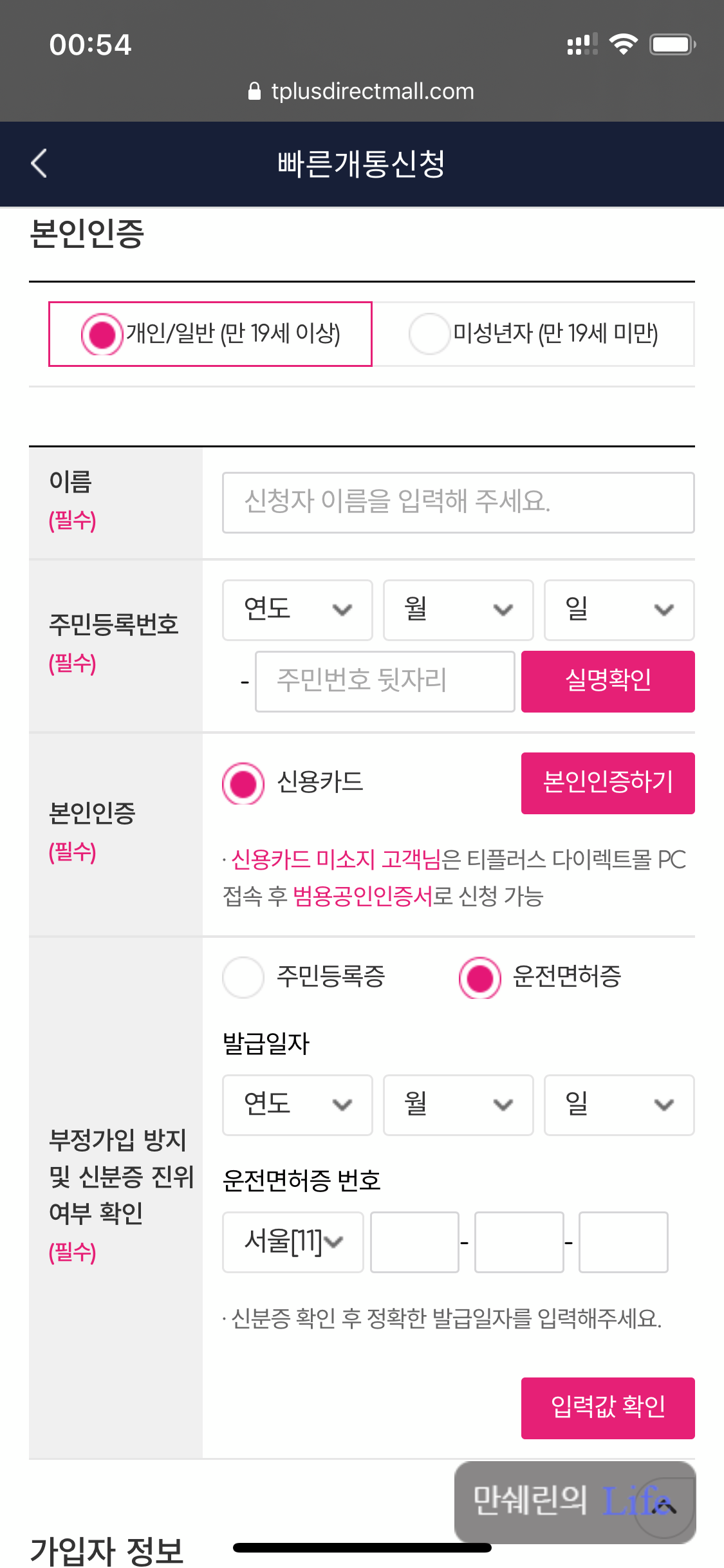 본인을 인증 할 수 있는 주민등록증이나 운전면허증의 정보를 입력하면 됩니다.