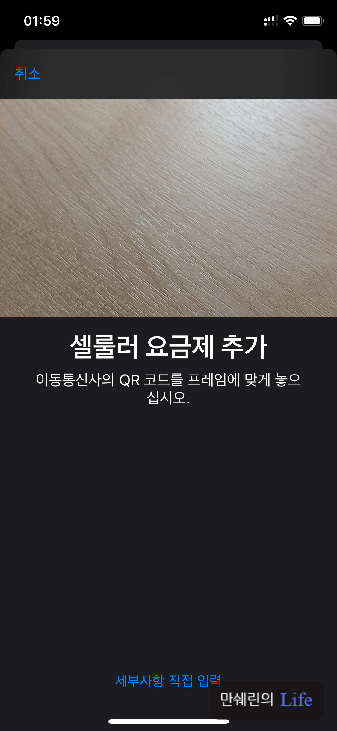 QR코드를 스캔하기 위한 카메라가 열리는데 당장에 QR코드를 스캔 할 수 없으니 세부사항 직접 입력을 선택해 줍니다.