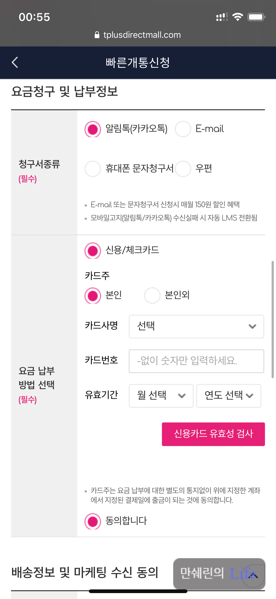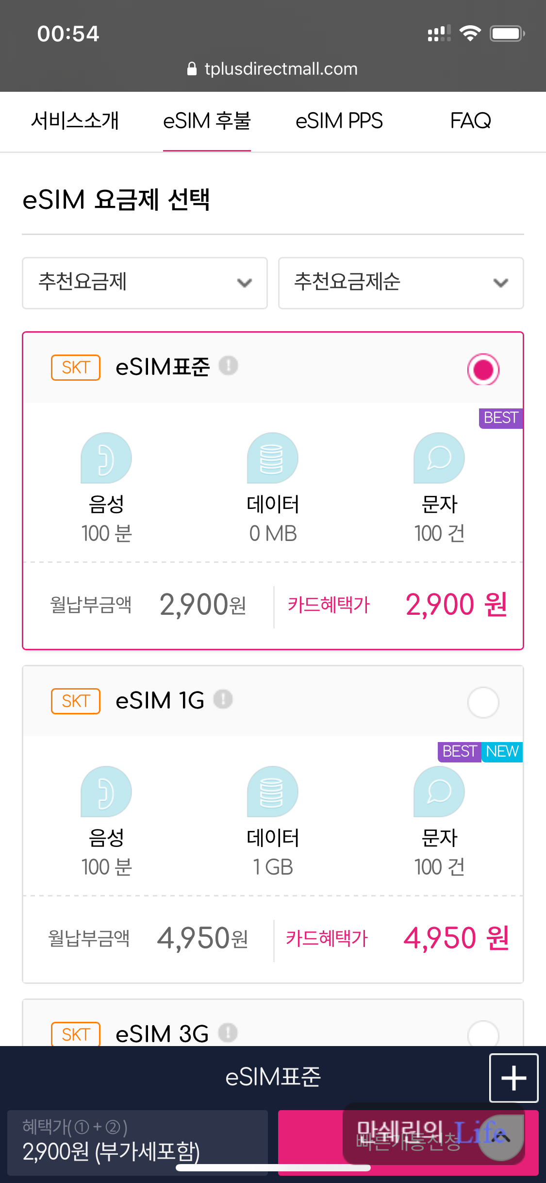 만약 데이터를 이용하고자 한다면 더 높은 요금제를 이용해도 되겠으나 저는 테스트용이라 가벼운 요금제를 선택했네요.