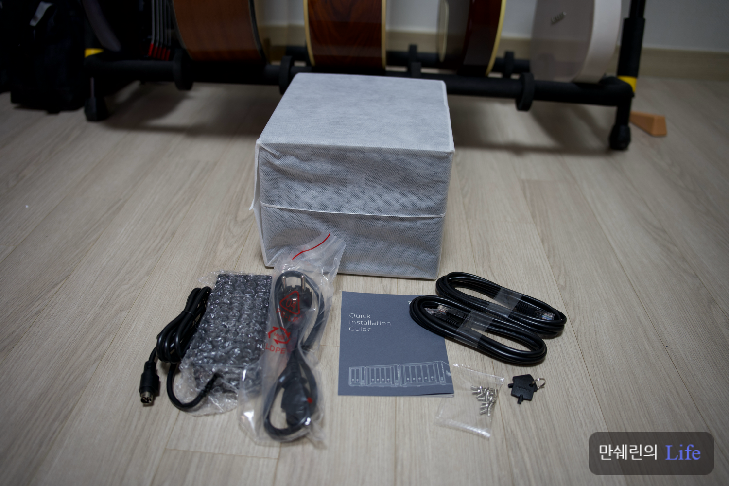구성품은 본체, 어댑터, 랜선2개, 하드디스크 트레이 잠금 키 2개, SSD 고정용 나사, 설명서 입니다.