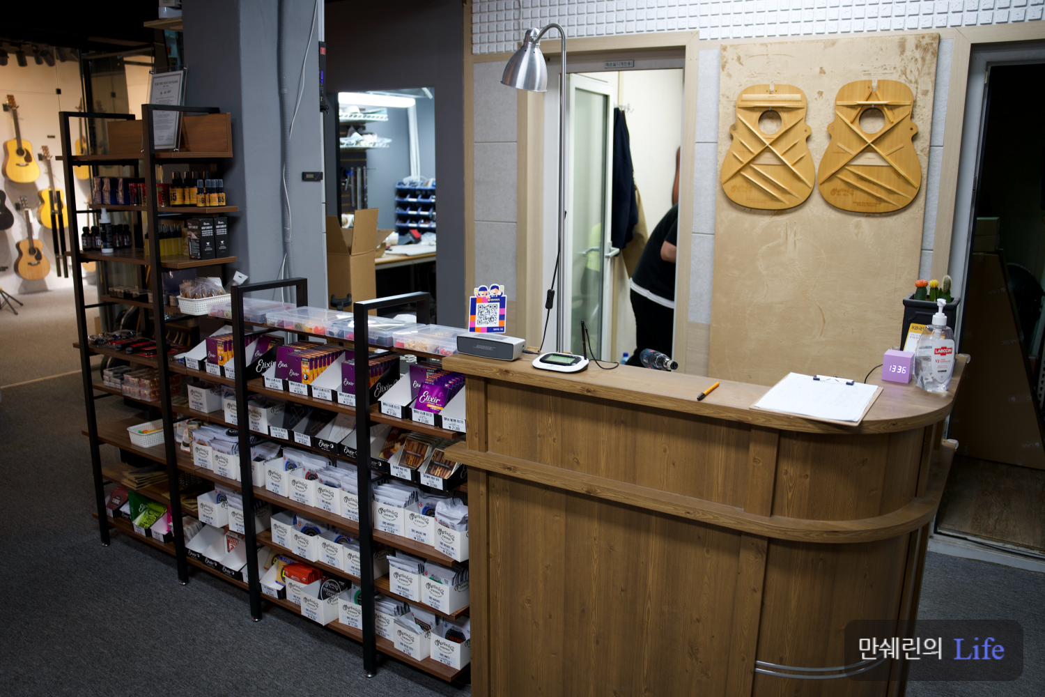 출입문을 열고 들어가면 바로 오른쪽에 기타줄을 구매할 수 있는 매대가 있습니다.