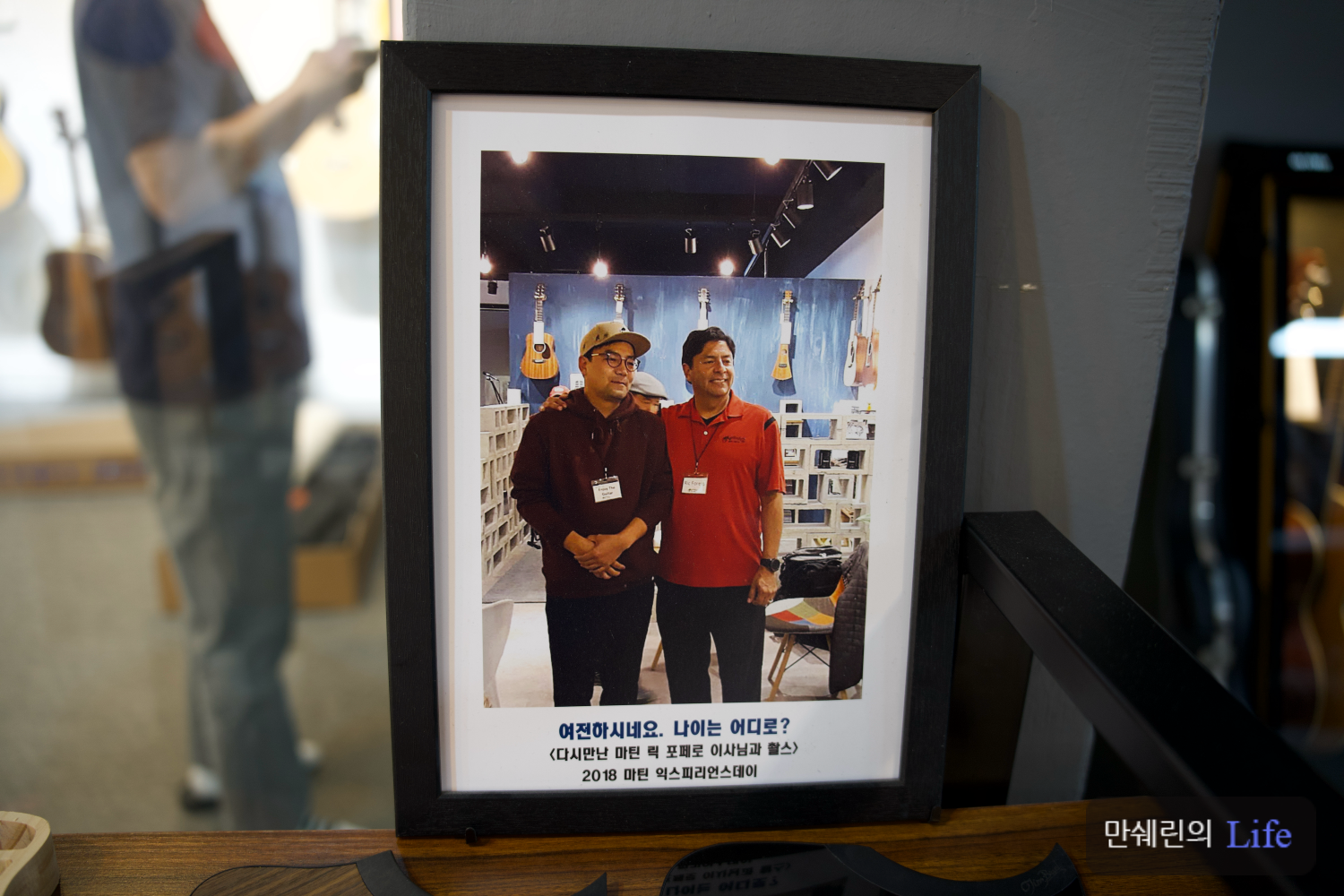 오른쪽 벽 상단에는 마틴 기타의 상판을 걸어 두었습니다.