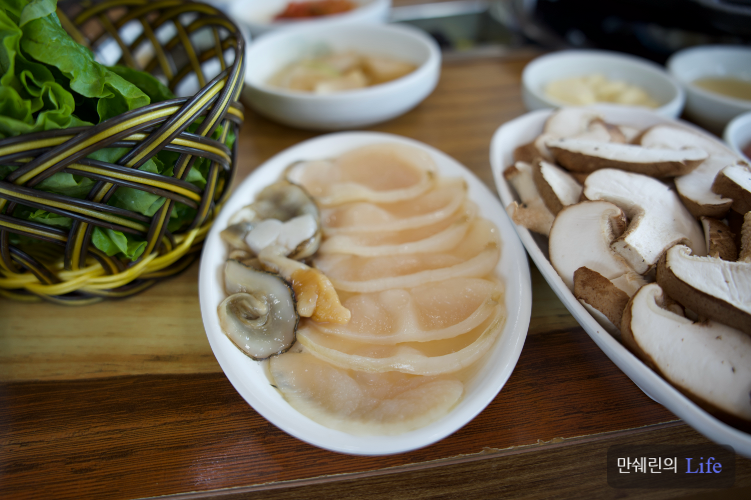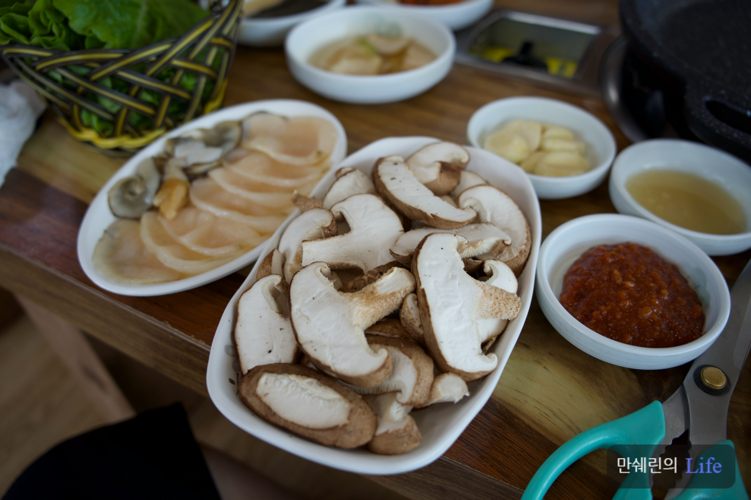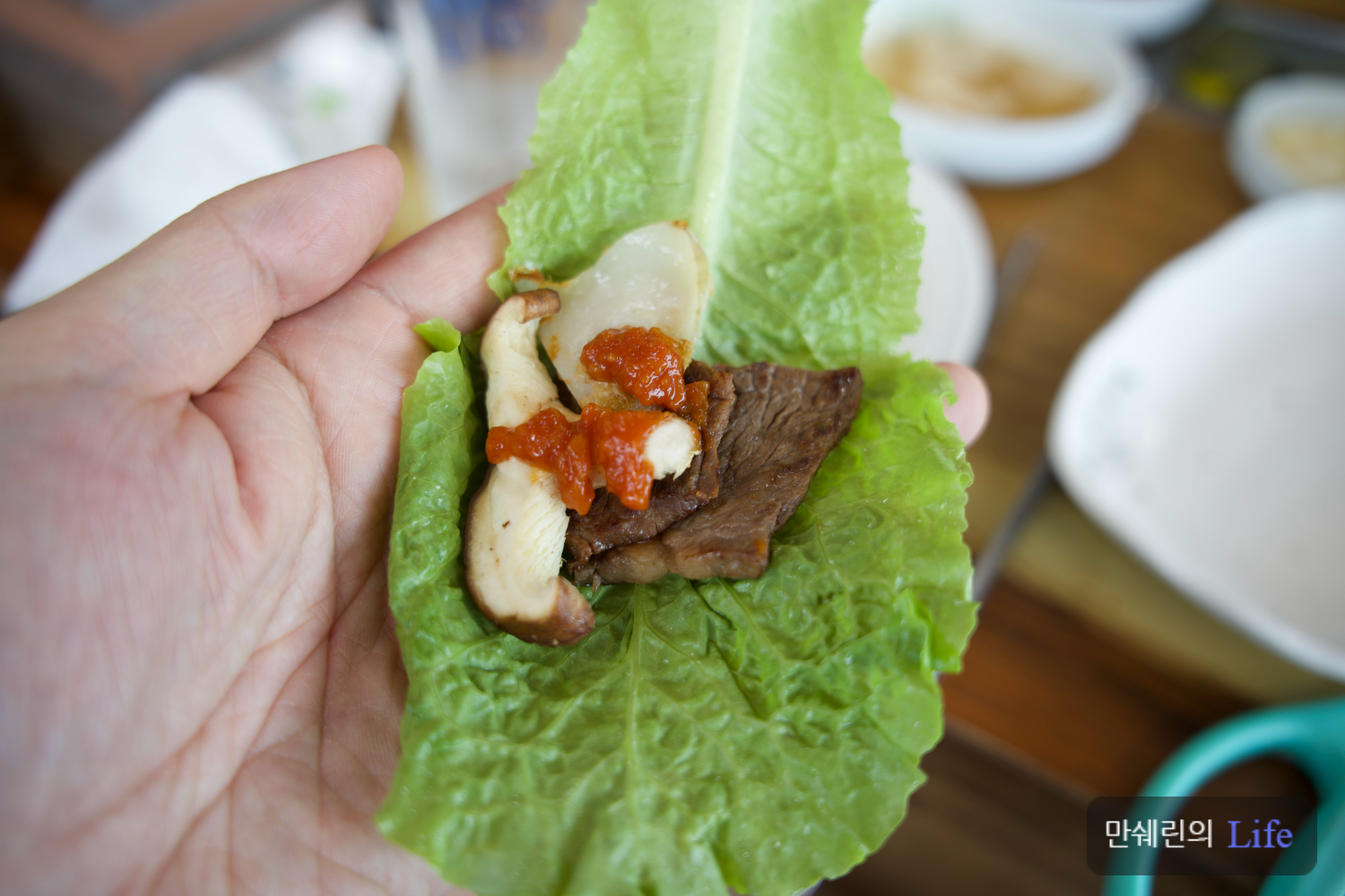 이렇게 한쌈 먹으면 입안에 소고기 육즙과 키조개 관자의 맛, 표고버섯의 향이 어우러져서 정말 끝내줍니다.