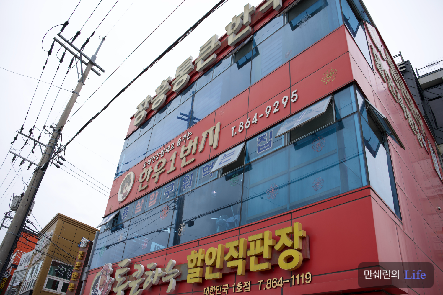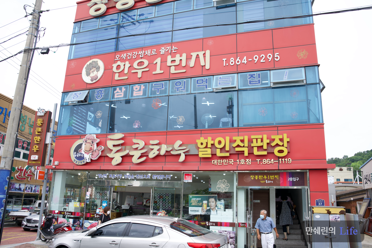 1층에서 소고기를 구매하여 2층으로 올라가 삼합을 구어 먹으면 되는 정육식당 구조 입니다.