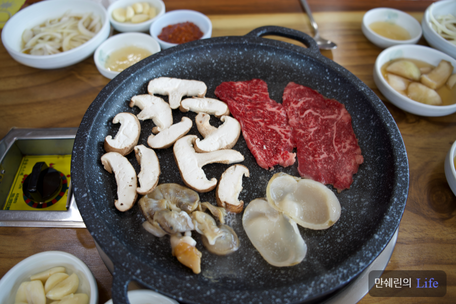 돌판에 소고기, 표고버섯, 키조개 관자를 잘 구어줍니다.