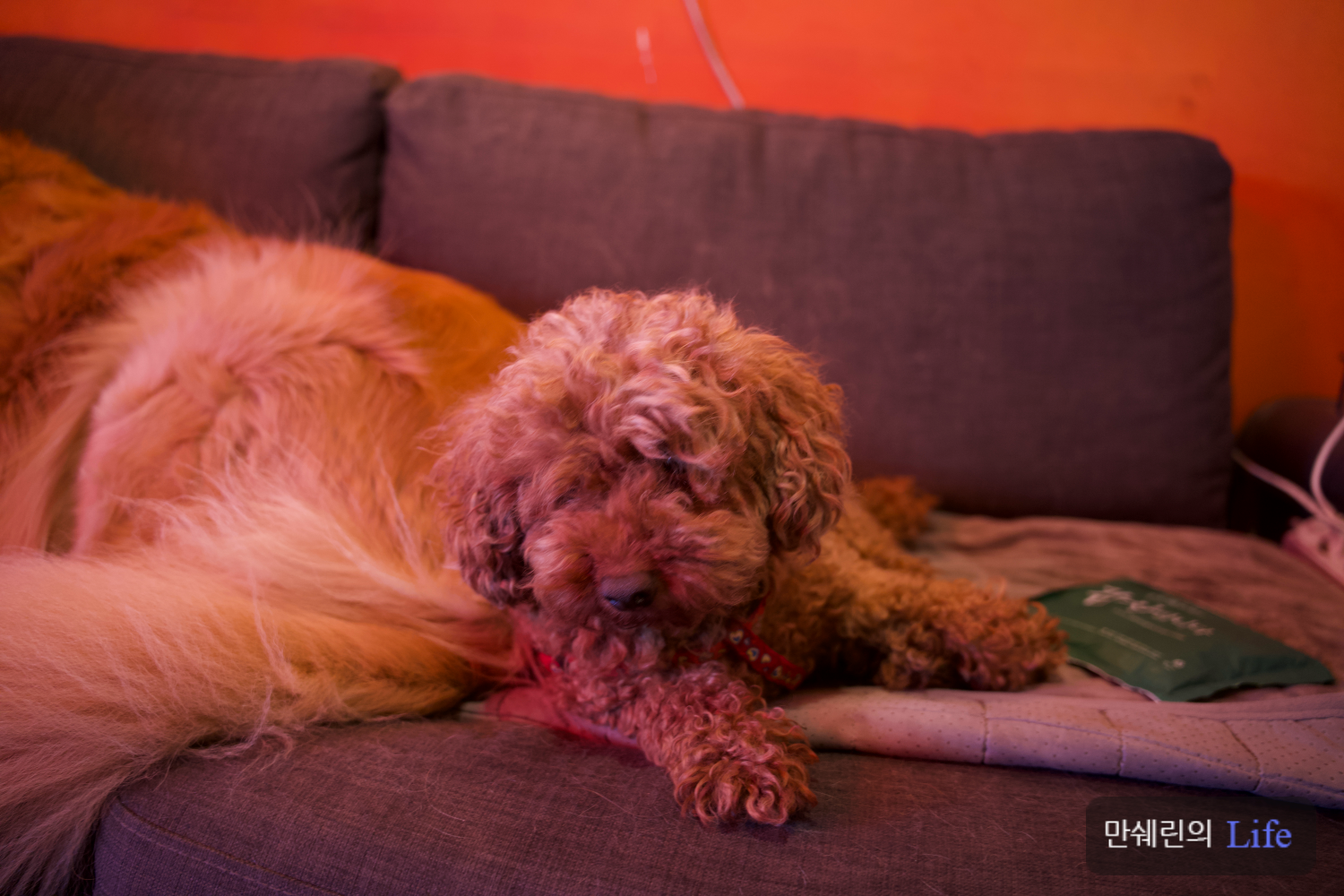 매장의 조명이 어둡고 갈색 푸들이라 자주 사람들에게 치어서 그런지 경계심이 많아요!