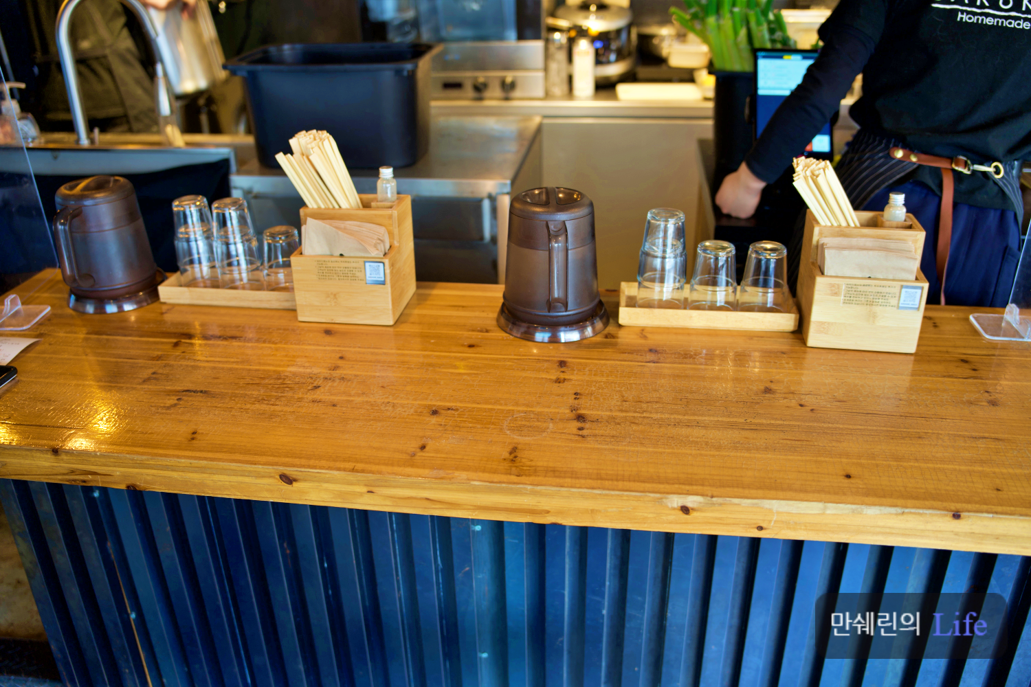 앞에는 물과 컵, 젓가락, 냅킨이 준비 되어 있습니다.