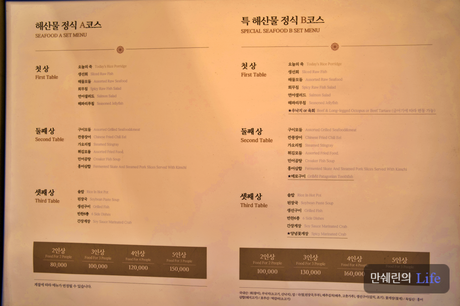 일반 해산물 정식 A코스와 특 해산물 정식B코스 입니다.