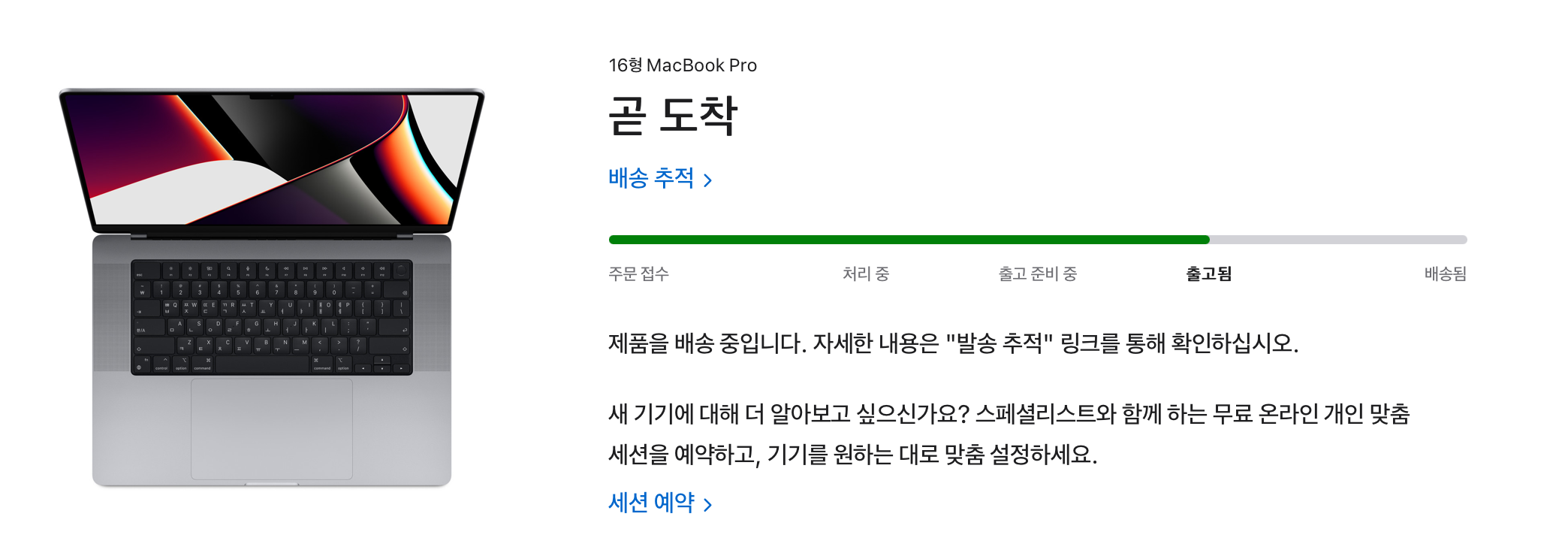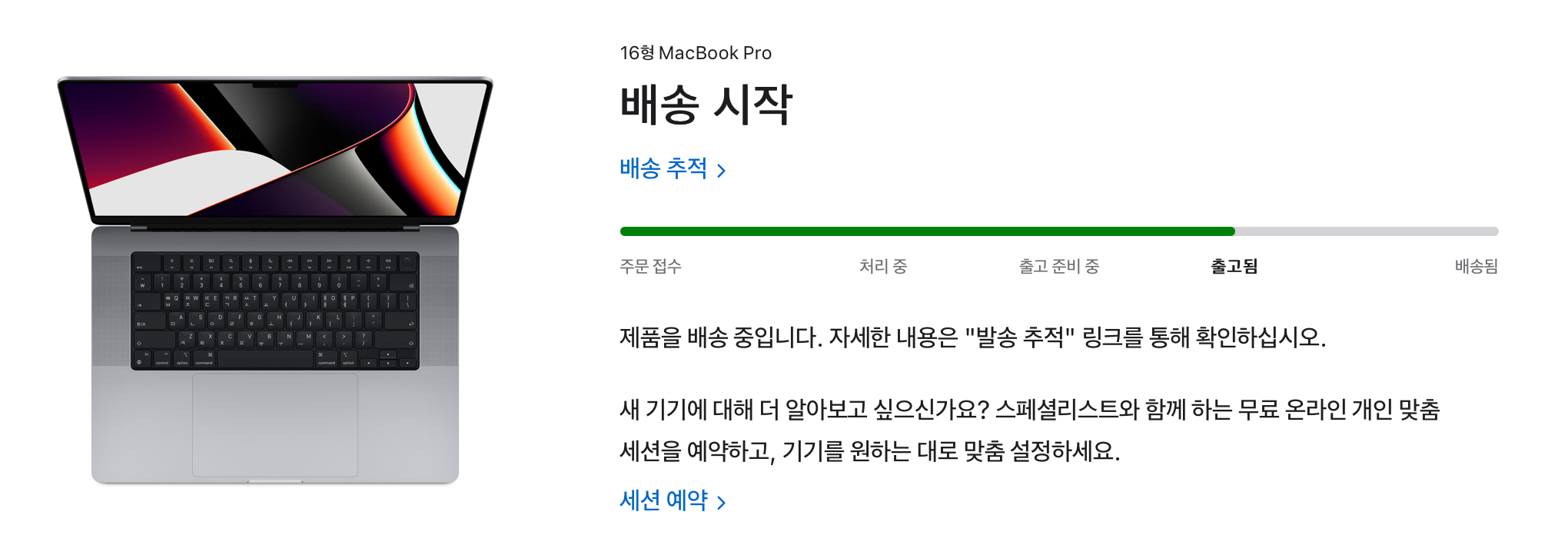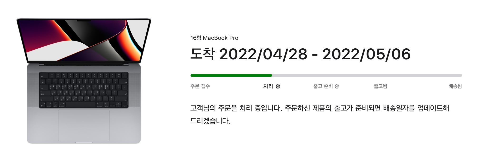 그 전에 쓰던 맥북프로도 CTO주문이었는데 2주 정도 걸렸는데, 이번에 주문한 맥북프로는 6주정도 예정이었습니다.