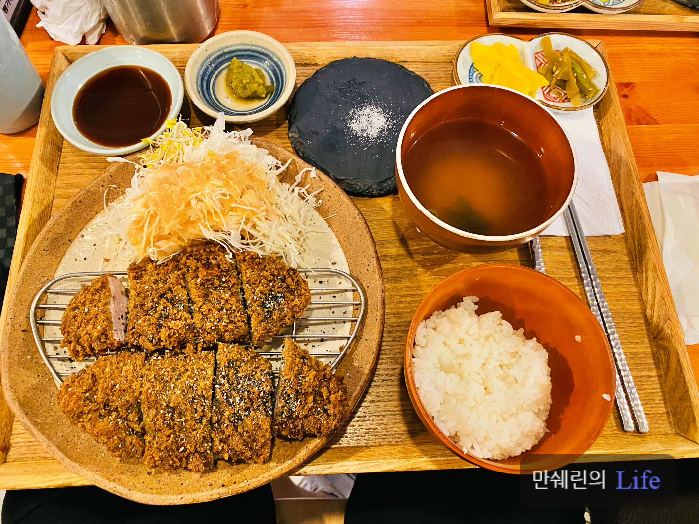 소스와 와사비, 소금을 찍어먹을 수 있고 양배추 샐러드, 국과 밥, 단무지와 장아찌가 제공됩니다.