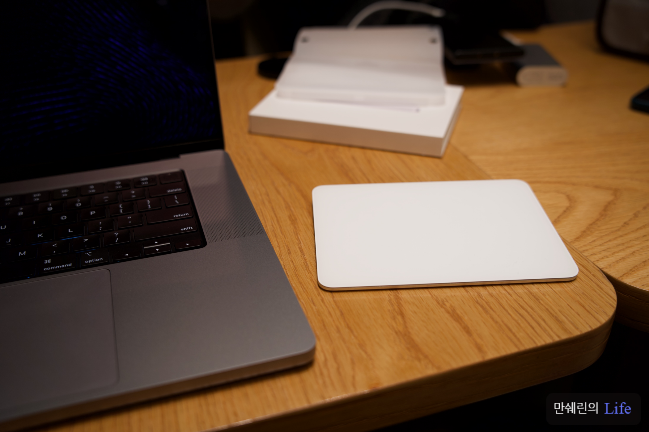 매직트랙패드2를 구매하고자 고민을 많이 했던 이유는 오른손 엄지손가락에 건초염으로 인한 통증이 있어 오른손 사용을 최대한 자제하고자 하면서 살까 말까 고민하였습니다.