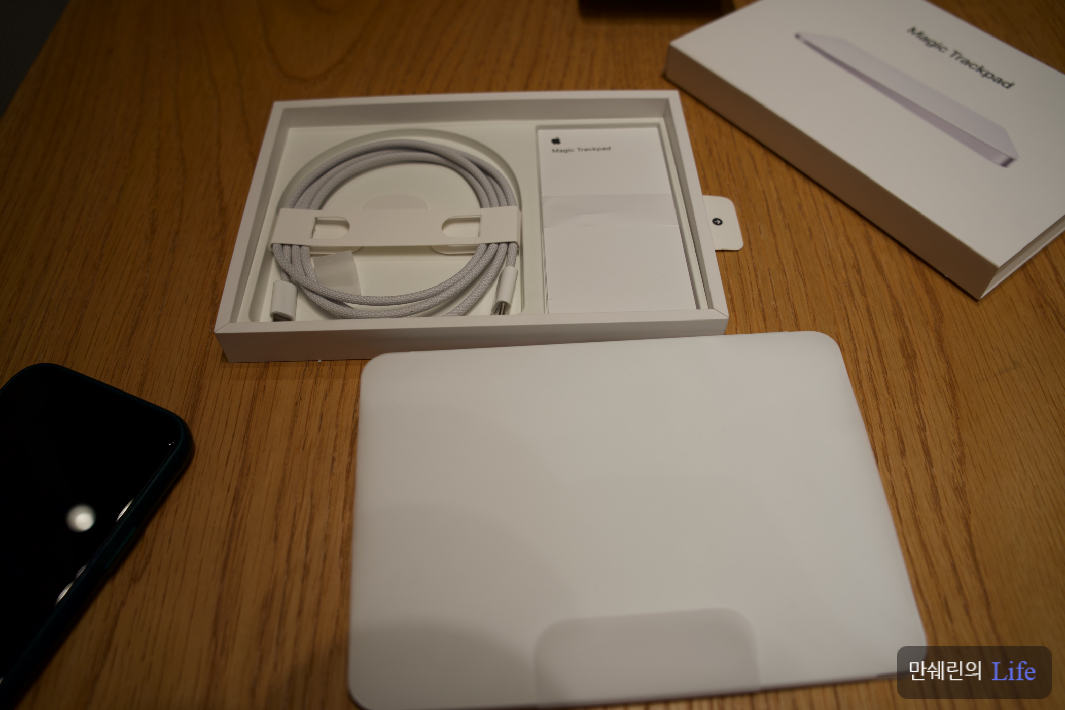 매직트랙패드2를 들면 라이트닝 케이블과 설명서가 동봉되어 있습니다.