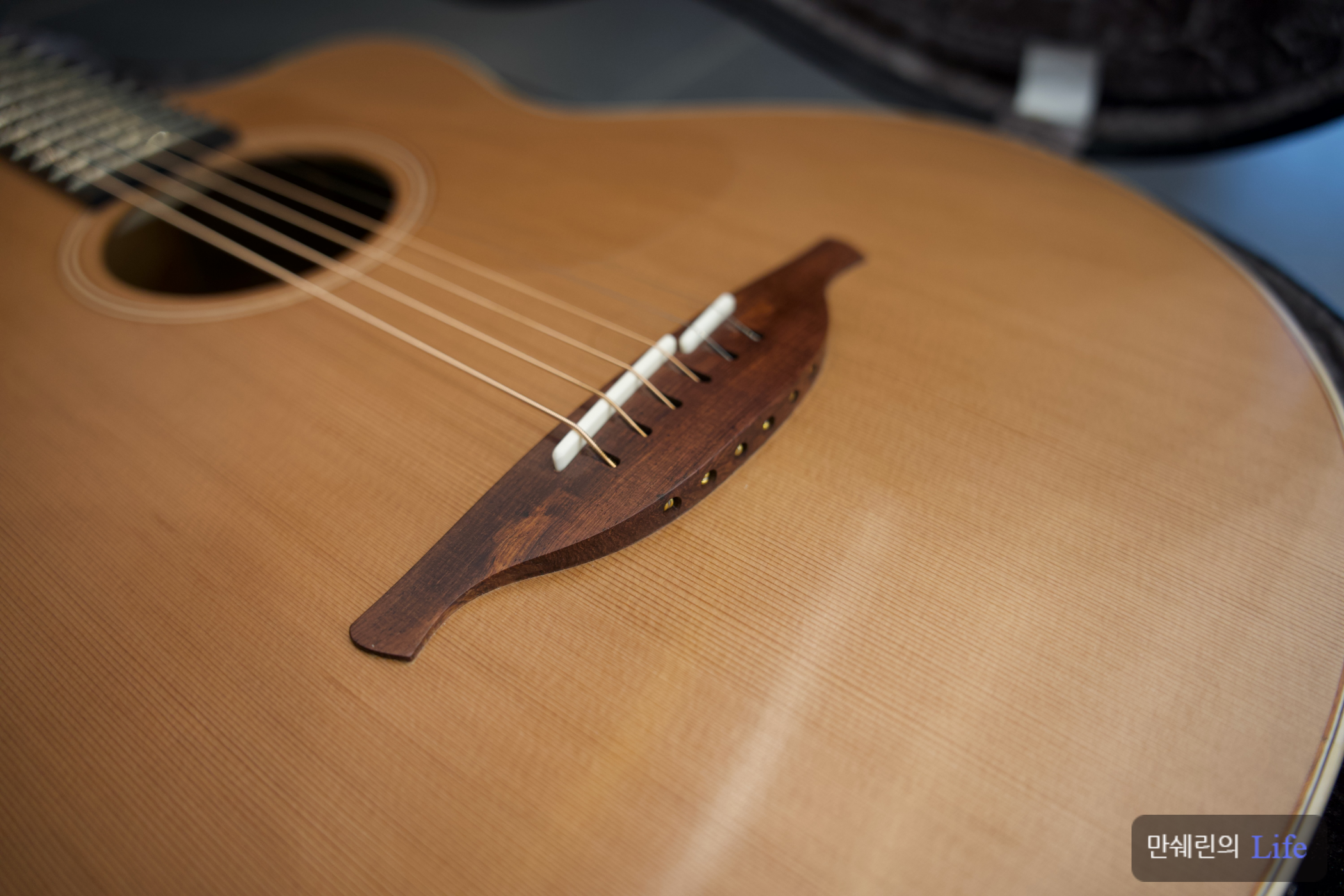 그래서 브리지 쪽을 보게 되면 일반적인 기타에 비해 사운드 홀이 브리지에서부터 거리가 좀 더 있습니다.