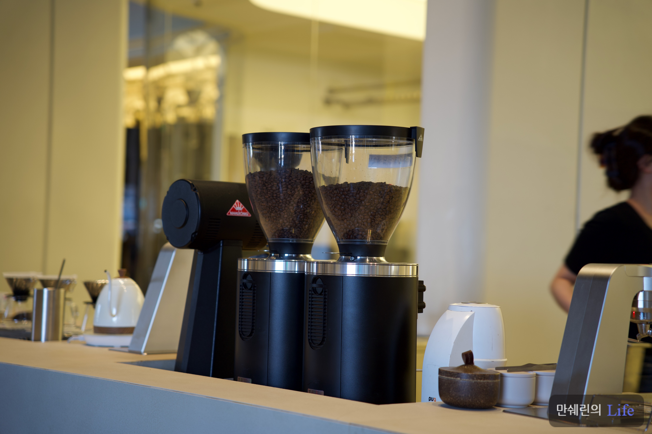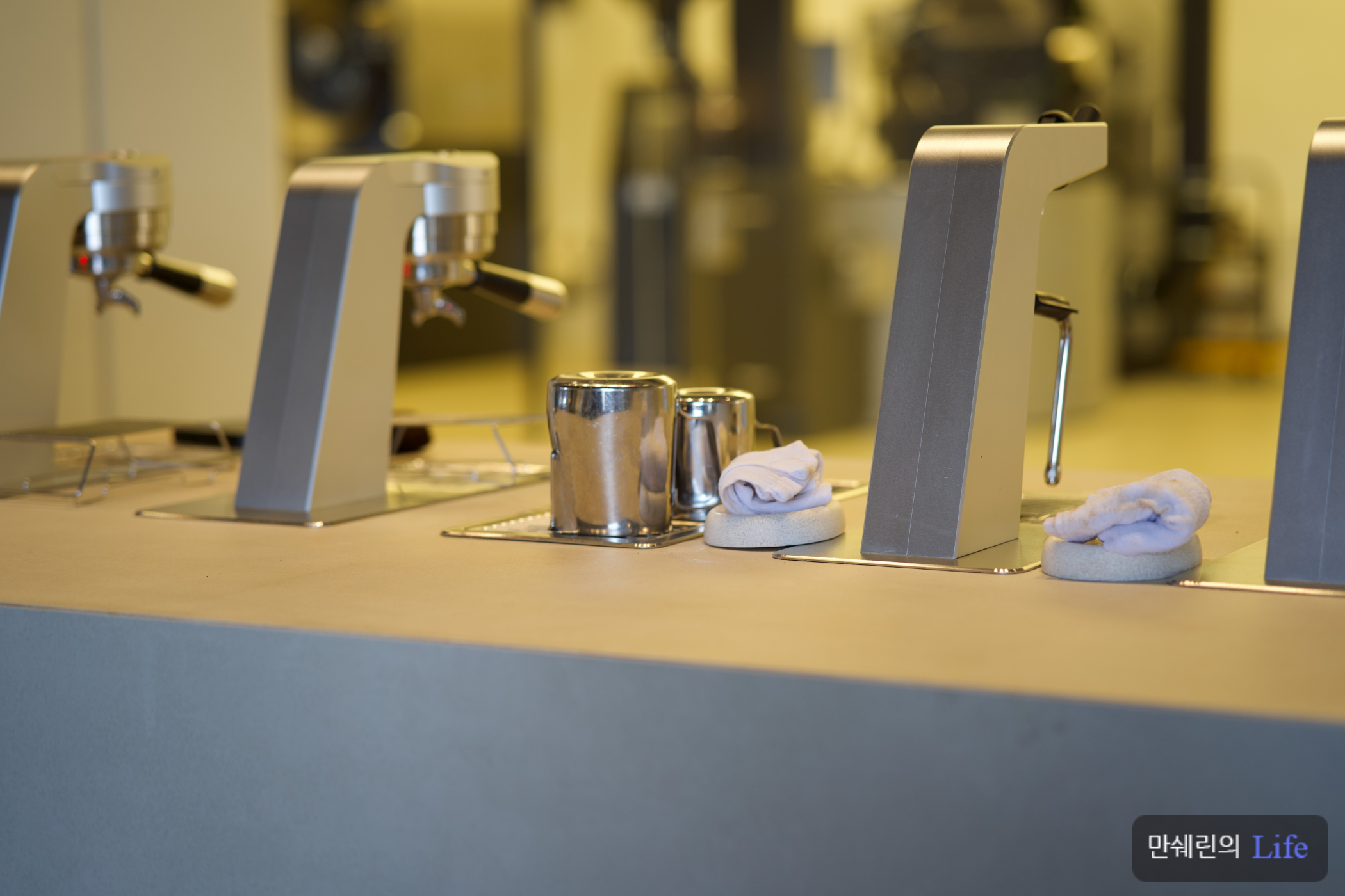 에스프레소 머신과 스팀기가 한 테이블에 쭉 이어서 설치되어 있어서 프로세스를 동선에 맞춰서 쭉 갈 수 있게 해 둔 게 인상적입니다!