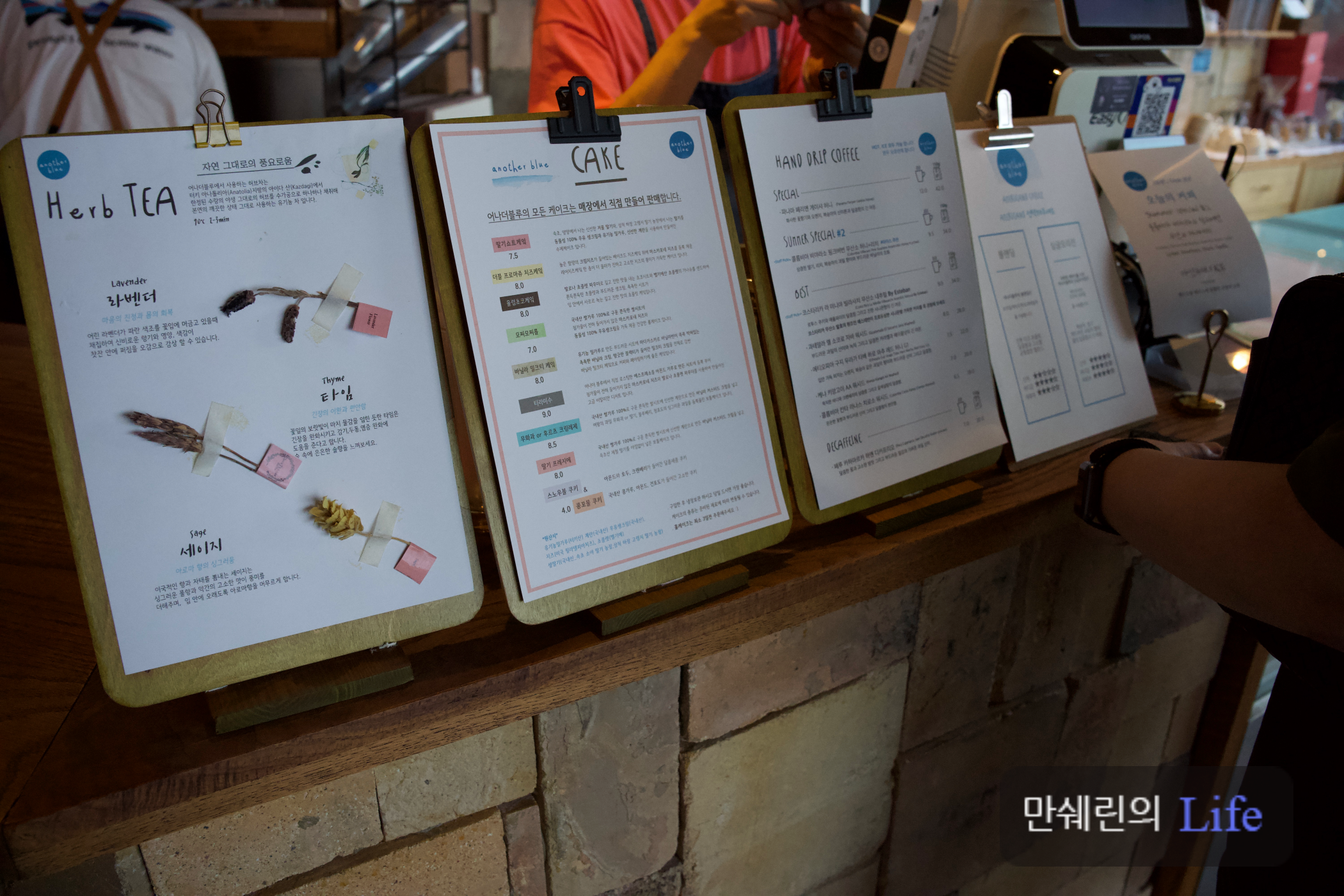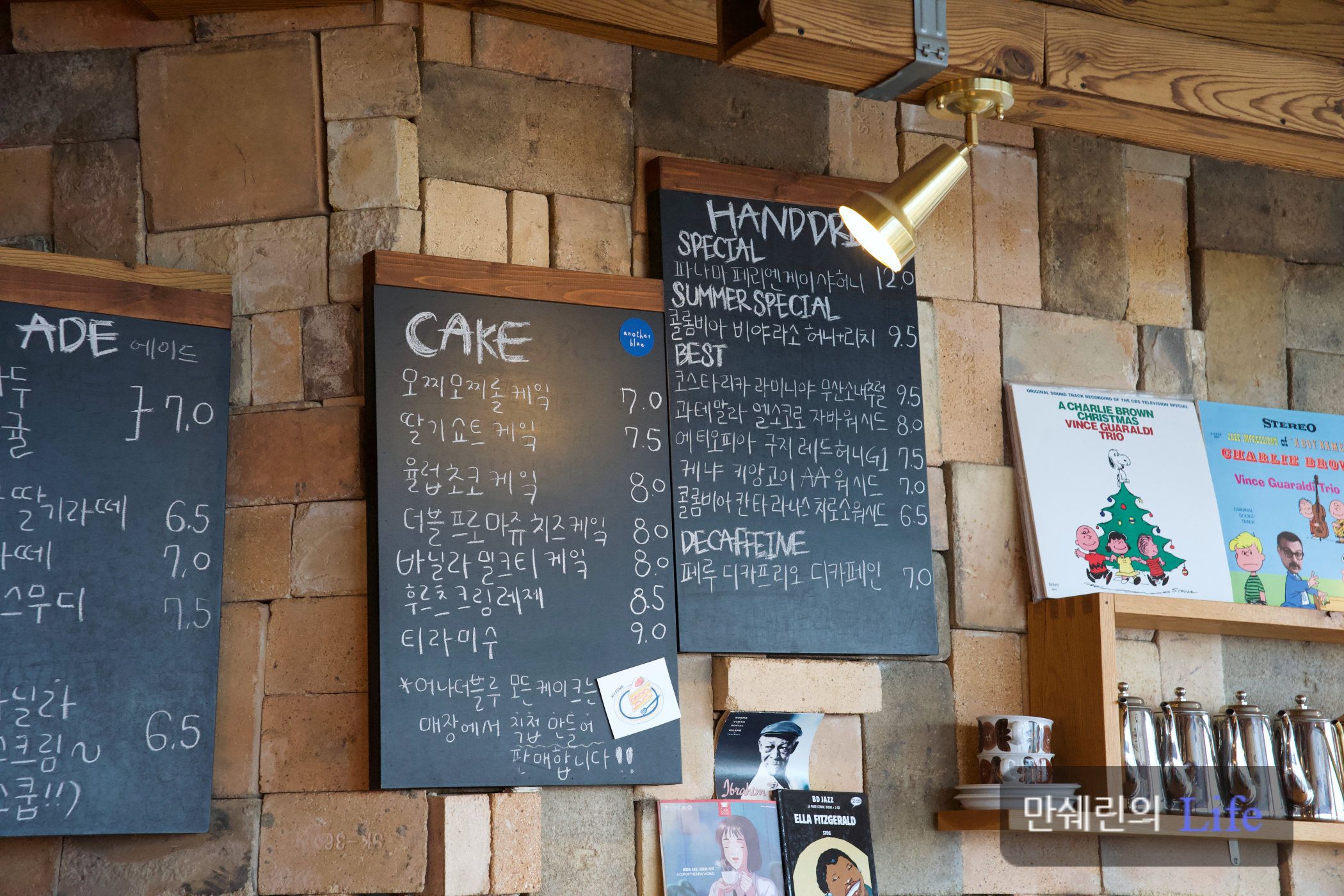 오른쪽 메뉴판에 케이크와 핸드드립 커피가 적혀 있습니다.