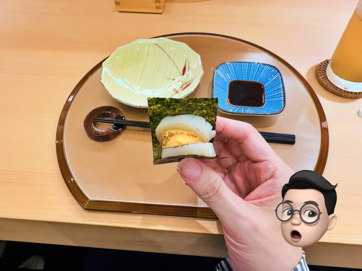 다음으로 나온 건 가리비 관자에 성게로 만든 무스를 올려 김에 싸 먹는 음식이었습니다.