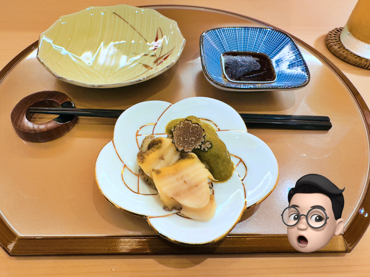 이븐 하게 익힌 전복과 전복 내장 스시에 트러플을 곁들인 음식이었습니다.