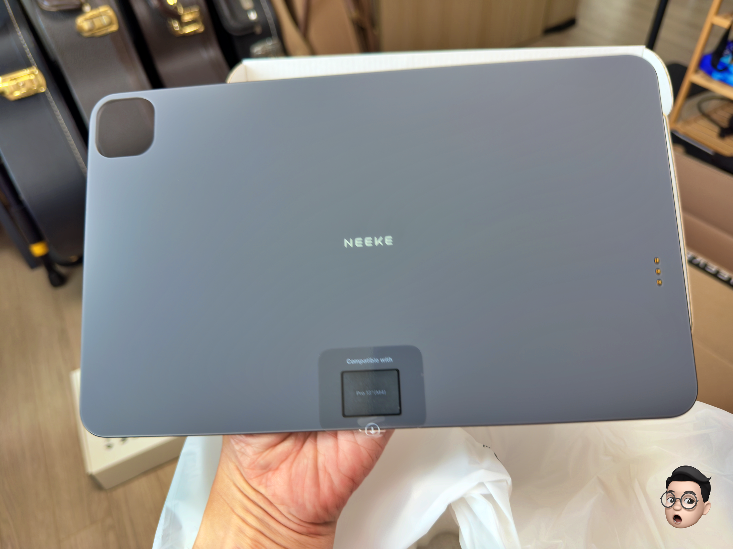 기존의 제품과 가장 다른점은 크기가 좀 더 커졌고 카메라 섬을 고정할 수 있는 구멍이 있어서 거치가 좀 더 쉬워졌고, 포고핀이 있어 아이패드를 붙이기만 하면 충전이 가능하게 되었습니다.