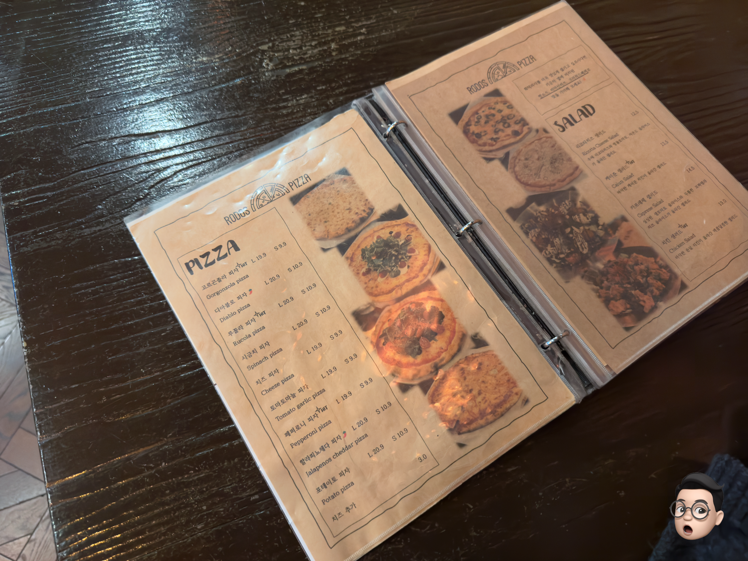 피자종류와 샐러드, 뒷면에는 리조또 종류가 있는데 찍는 걸 깜빡했습니다.