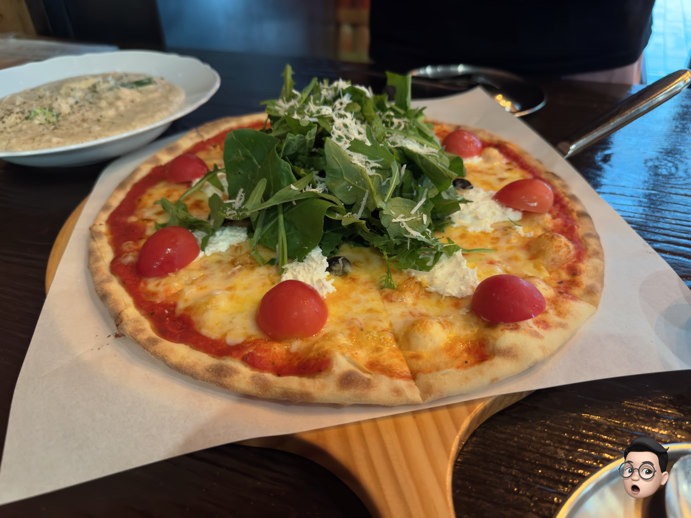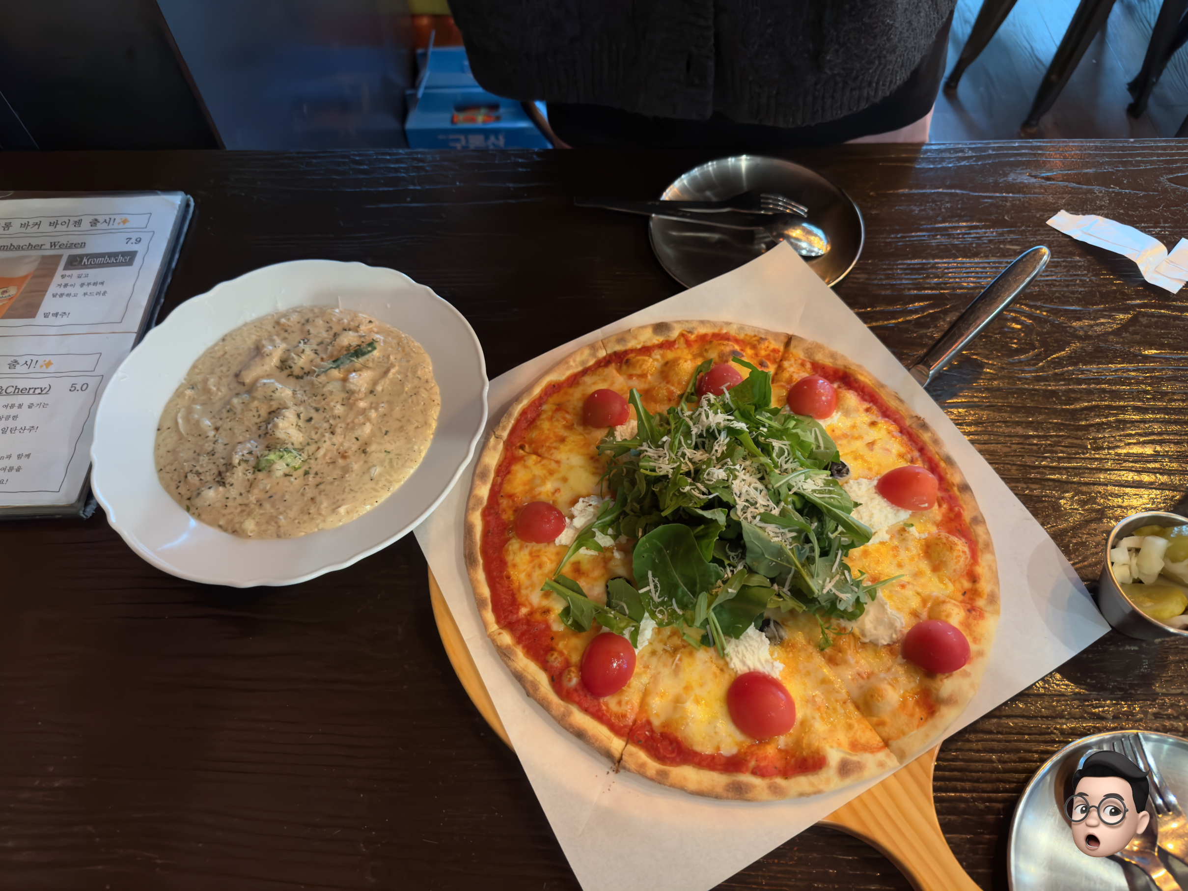 다소곳하게 자른 루꼴라 피자와 명란 크림 리조또 입니다.